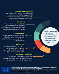 Le SER Hub fonctionne selon une feuille de route structurée en cinq étapes : repérage, études de faisabilité, conception du projet, mise en œuvre et clôture. Cette approche holistique garantit l’impact et l’efficacité des rénovations.
